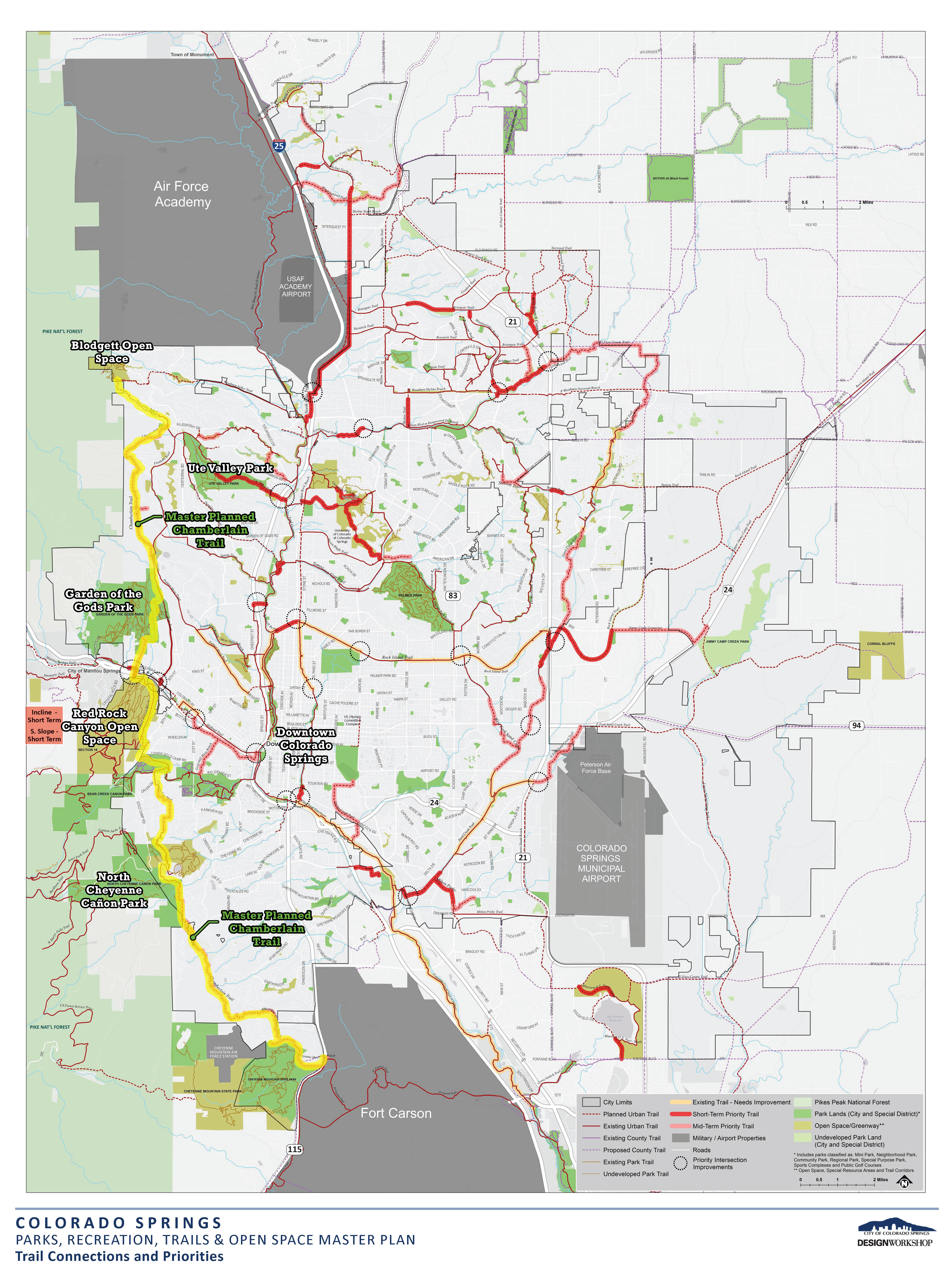 The Chamberlain Trail is envisioned to provide a unique backcountry experience along the foothills of the City of Colorado Springs by eventually connecting Blodgett Open Space all the way to Cheyenne Mountain State Park. The 26-mile master-planned trail, identified in the 2014 Park System Master Plan, will traverse through Blodgett Open Space, Red Rock Canyon Open Space, Bear Creek Regional Park, Stratton Open Space, North Cheyenne Cañon Park and Fishers Canyon Open Space.