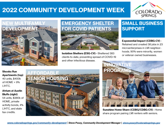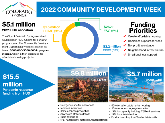 The City of Colorado Springs received $5.1 million in Housing and Urban Development funding for our 2021 program year. The Community Development Division also typically received between $300,000 and $500,000 which is then prioritized for affordable housing projects.