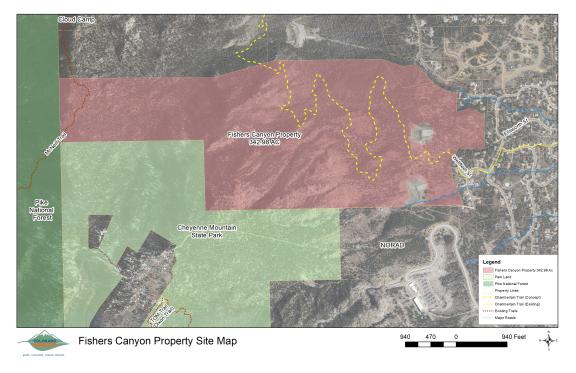 Fishers Canyon borders Cheyenne Mountain State Park to the south, the Broadmoor Bluffs neighborhood to the east and the Pike National Forest to the west (see map at bottom of page). The 2014 Park System Master Plan identified this area as a valuable candidate property for the City’s open space system. It could unlock several significant trail connections, including a key piece of the Chamberlain Trail, which is a long-envisioned 26-mile north-south trail along the western foothills that could connect Blodgett Peak to Cheyenne Mountain.
