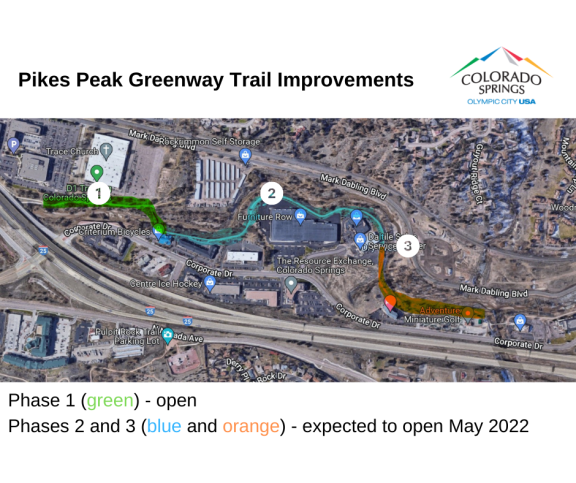 A detour is still in place while work completes on the second and third phases, so please follow detour signage. The full project covers a 1.25-mile stretch of trail. It runs north to the confluence of Cottonwood Creek along Monument Creek, near Pikes Peak Indian Motorcycle. The remaining two phases on track to be complete in May 2022.