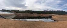 Crystal Creek Reservoir is one of three reservoirs operated by Colorado Springs Utilities on the North Slope of Pikes Peak. The Pikes Peak Highway crosses the reservoir dam approximately 4.5 miles from the toll entrance. The reservoir is drawn down and remains closed to boating and shoreline fishing, although designated area trails remain accessible. Visitors are asked to stay out of fenced construction areas.