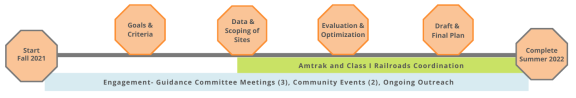 This recorded presentation is the second of the project’s major stakeholder engagement milestones. The presentation provides an overview of the project to date, the evaluation criteria, station location evaluations, and the recommended rank order of passenger rail station locations.