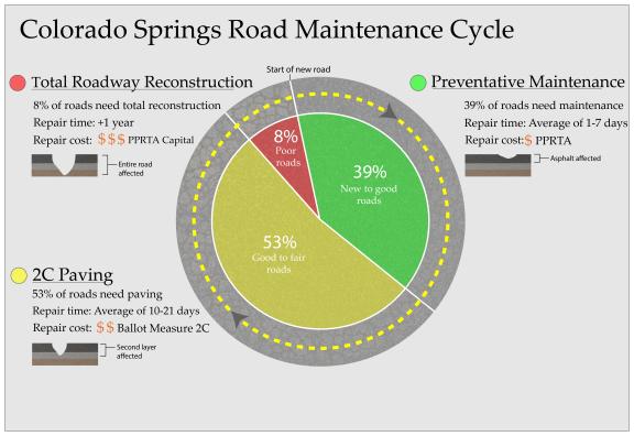 Year after year, the streets of Colorado Springs slowly deteriorate with continued use. Cracks start to appear, pot holes grow, and roadways begin to show the need for maintenance. Yet maintenance isn’t as easy as fixing the roads with the most potholes. Choices such as what roads we repair and when can determine the longevity of our roadways and how much money we can invest in them.