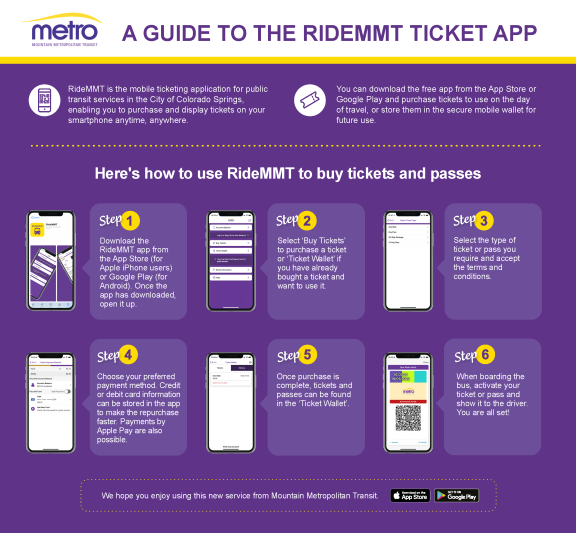 RideMMT is the mobile ticketing application for public transit services in the City of Colorado Springs, enabling you to purchase and display tickets on your smartphone anytime, anywhere.